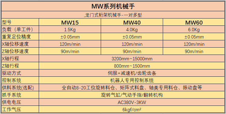 MW系列機(jī)械手作為長行程機(jī)械手,采用龍門式立柱機(jī)構(gòu)加鋼梁組成,可同時(shí)搭配多套Z軸模塊,具備同時(shí)與多臺(tái)數(shù)控機(jī)床聯(lián)機(jī),可實(shí)現(xiàn)產(chǎn)品從毛坯到成品的自動(dòng)化生產(chǎn),當(dāng)設(shè)備加配在線檢測、在線打標(biāo)、在線讀取等設(shè)備后,可完成監(jiān)控每一個(gè)零件的生產(chǎn)過程,是組建數(shù)字化無人工廠的利器。該系列機(jī)械手實(shí)用于工件的多工序加工。